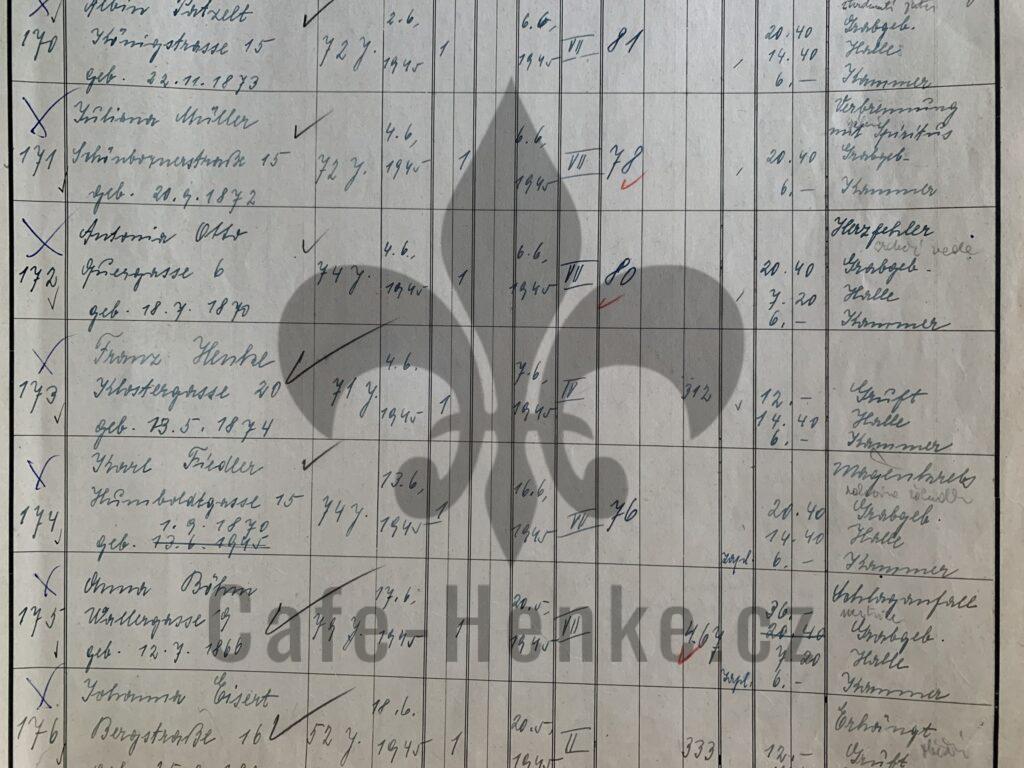 Dnes je nová budova opatřena jedním č.p. 3 se dvěma čísly orientačními č.2 v Nerudově ulici (naposledy jídelna) a č. 20 na třídě 9. května (rohová budova). Jak to ale bylo před vznikem nové budovy? I když sčítací operáty z roku 1921 uvádí ovdovělého otce mezi 15 obyvateli jednoho bytu na 3/20, v úmrtní knize je adresa obou rodičů na Königstrasse 2 (tedy v budově “jídelny” na Nerudově 2). Úmrtní kniha Franze Henkeho juniora pak vede již s adresou Klostergasse 20 (tedy dnešní třída 9. května 3/20). Otázka tedy zní: Byly zde před přestavbou dva samostatné domy? Dnešní číslování i zápis v úmrtní knize by tomu nasvědčovaly.