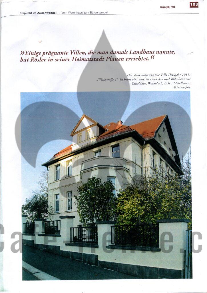 Když jsem se na internetu zajímal o plavenskou ulici Am Froschteich, našel jsem v jejím těsném sousedství ulici Rankestraße, kde právě prodávali dům č. 7a s röslerovskými motivy. Nenapadlo mě, že by se mohlo jednat o dům stavebního mistra Richtera… Adresář mu totiž už dávno přiřadil dům s č.2 na dnešní Alte Zwoschwitzerstraße, viz následující dům, a na první dobrou měl dům i jiného majitele. Avšak po prozkoumání historie domu na Rankestraße 7 se ukázalo, že ho po dostavbě v roce 1934 Richter krátce vlastnil.