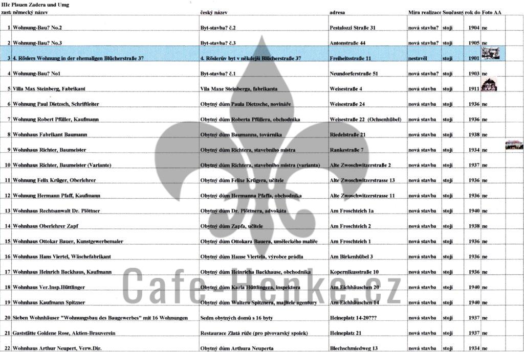 Dle adresáře byl obytný dům ?řídícího učitele Krügera na Zadeře, Zwoschwitzerstrasse 13 (dnes pravděpodobně Alte Zwoschwitzerstrasse) dostaven mezi lety1935-6. (Adresář 1935 chybí). Předtím Krüger bydlel na König-Georg-Straße 18.