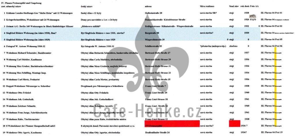 Zatímco (P1) uvádí 8 obytných domů Plavenské stavební společnosti s.r.o. v Preißelpöhlu v období mezi 1935-1945, z (P4c) se dovídáme o řadových domech v Preißelpöhlu z roku 1936. Protože se v obou pramenech vyskytuje vždy jen jedna varianta a údaje se vzájemně nevylučují, ale spíš upřesňují, předpokládám, že se jedná o tytéž domy.